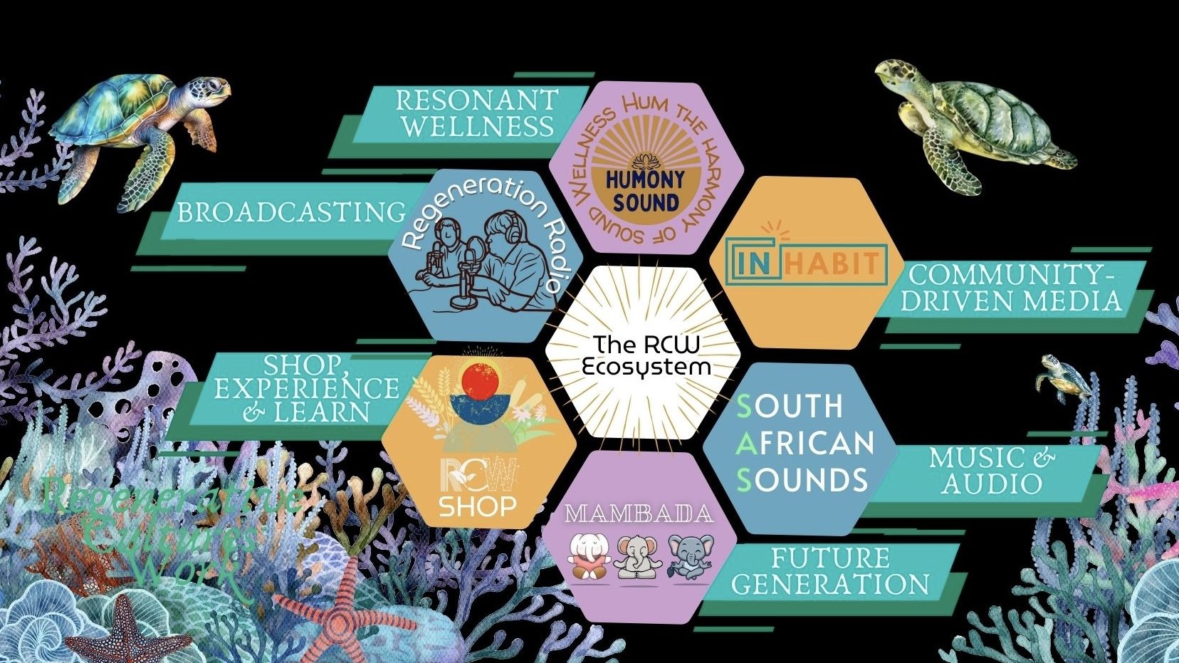 To begin the RCW community, we are creating a ‘coral reef’ of initiatives that are designed to integrate together to unlock our communities’ potential to power up our own regeneration on individual and community levels.
